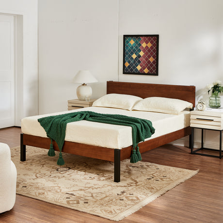 Portland Wood Slat and Metal Platform Bed Frame with Solid Wood Headboard | Mattress Foundation